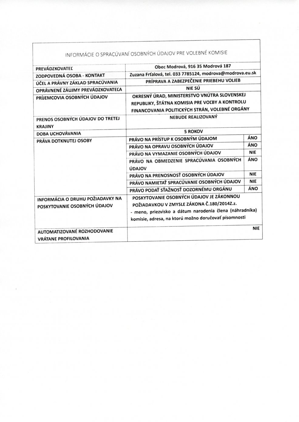 Informácie o spracúvaní osobných údajov pre volebné komisie