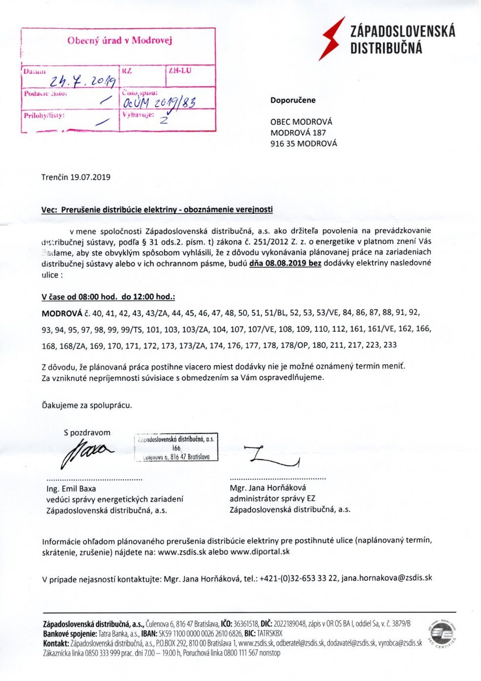 Prerušenie distribúcie Elektriny 8.8.2019