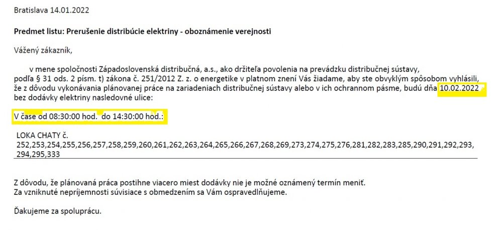 ZSE odstávka elektriny lokalita Chaty 10.02. 2022