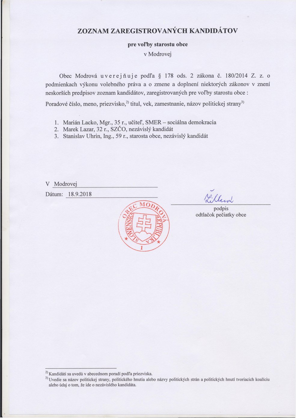 Zoznam zaregistrovaných kandidátov na starostu obce